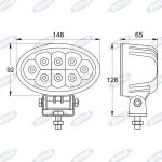 Faro ovale a 8 led a 24W da 12-28V. Corpo in alluminio e lente in policarbonato.